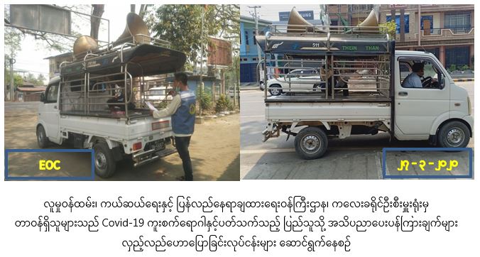 လူမှုဝန်ထမ်း၊ ကယ်ဆယ်ရေးနှင့် ပြန်လည်နေရာချထားရေးဝန်ကြီးဌာန၊ ဘေးအန္တရာယ်ဆိုင်ရာ စီမံခန့်ခွဲမှုဉီးစီးဌာန၊ ကလေးခရိုင်ဦးစီးမှူးရုံးမှ တာဝန်ရှိသူများသည် (၂၇-၃-၂၀၂၀) ရက်နေ့တွင် ကလေးမြို့ ဗိုလ်ချုပ်လမ်းတစ်လျှောက် (ကလေးတက္ကသိုလ်အထိ)နှင့် ကလေးဝမြို့အထွက်လမ်းနှင့် နတ်ချောင်းလမ်းတစ်ဝိုက်တို့တွင် COVID -19 ကူးစက်ရောဂါနှင့်ပတ်သက်ပြီး ဆောင်ရန်/ ရှောင်ရန် တို့အား အသိပညာပေးခြင်းများဆောင်ရွက်လျက်ရှိကြောင်း သတင်းရရှိပါသည်။
