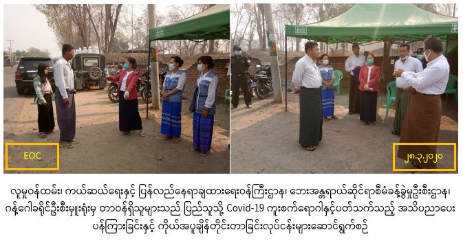 လူမှုဝန်ထမ်း၊ကယ်ဆယ်ရေးနှင့် ပြန်လည်နေရာချထားရေးဝန်ကြီးဌာန၊ ဘေးအန္တရာယ်ဆိုင်ရာစီမံခန့်မှုဦးစီးဌာန၊ ဂန့်ဂေါခရိုင်ဦးစီးမှူးရုံးမှ တာဝန်ရှိသူများသည် (၂၈-၃-၂၀၂၀) ရက်နေ့၌ လတ်တလော နိုင်ငံအသီးသီးတွင် ကူးစက်ပြန့်ပွားလျက်ရှိသော Covid-19 ကူးစက်ရောဂါ ကြိုတင်ကာကွယ်ရေးအတွက် ဂန့်ဂေါခရိုင် အတွင်း ယာဉ်အဝင်အထွက်စီးနင်း လိုက်ပါလာသော ခရီးသည်များအား ကိုယ်အပူချိန်များတိုင်းထွာပေးခြင်းနှင့် ပြည်တွင်းပြည်ပမှ ပြန်လာသူများအား စာရင်းပြုစုခြင်းတို့ကို ခရိုင်အုပ်ချုပ်ရေးမှူး၊ မြို့နယ်အုပ်ချုပ်ရေးမှူး၊ ဌာနဆိုင်ရာအသီးသီးမှ တာဝန်ရှိသူများနှင့်အတူ ပူးပေါင်းပါဝင် ဆောင်ရွက်လျက်ရှိပါကြောင်း သတင်းရရှိပါသည်။