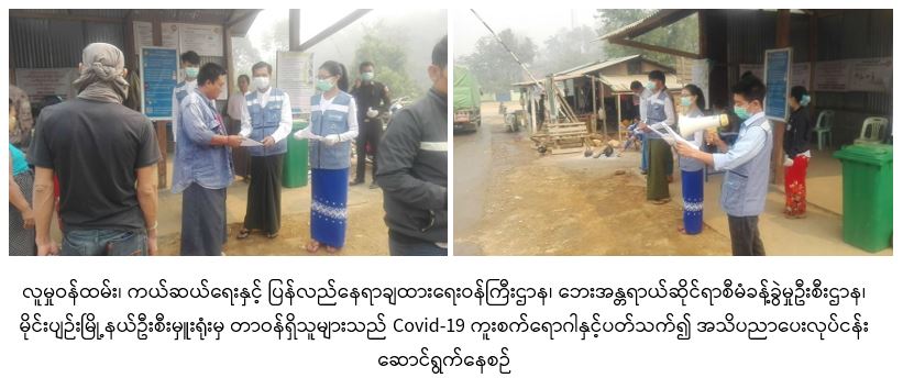 လူမှုဝန်ထမ်း၊ ကယ်ဆယ်ရေးနှင့် ပြန်လည်နေရာချထားရေးဝန်ကြီးဌာန၊ ဘေးအန္တရာယ်ဆိုင်ရာ စီမံခန့်ခွဲမှုဦးစီးဌာန၊ မိုင်းပျဉ်းမြို့နယ်ဦးစီးမှူးရုံးမှ တာဝန်ရှိသူများသည် (၂၈-၃-၂၀၂၀) ရက်နေ့တွင် မိုင်းပျဉ်းမြို့ ပေါ်ရှိ ရပ်ကွက်/ကျေးရွာများအတွင်း Covid-19 ရောဂါကူးစက်ပျံ့နှံ့မှုမဖြစ်ပွားစေရန် သိရှိလိုက်နာ ဆောင်ရွက်ရမည့်အချက်များကို ဌာနဆိုင်ရာများနှင့်ပူးပေါင်း၍ အသိပေးဟောပြောခဲ့ကြောင်း သတင်းရရှိပါသည်။