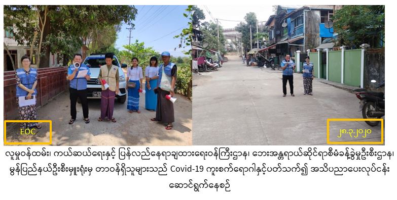 လူမှုဝန်ထမ်း၊ ကယ်ဆယ်ရေးနှင့် ပြန်လည်နေရာချထားရေးဝန်ကြီးဌာန၊ ဘေးအန္တရာယ် ဆိုင်ရာစီမံခန့်ခွဲမှုဦးစီးဌာန၊ မွန်ပြည်နယ်ဦးစီးမှူးရုံးမှ (၂၈-၃-၂၀၂၀)ရက်နေ့တွင် မော်လမြိုင်မြို့၊ မန္တလေးရပ်ကွက်နှင့် မုရောင်းကျေးရွာတို့တွင် Covid-19 ကြိုတင်ကာကွယ် ထိန်းချုပ်နိုင်ရန် ပြည်သူသို့ အသိပညာပေး ပန်ကြားချက်များအား လှည့်လည် ကြေညာခြင်းဆောင်ရွက်ခဲ့ကြောင်း သတင်းရရှိပါသည်။