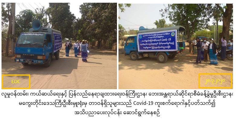 လူမှုဝန်ထမ်း၊ ကယ်ဆယ်ရေးနှင့် ပြန်လည်နေရာချထားရေးဝန်ကြီးဌာန၊ ဘေးအန္တရာယ်ဆိုင်ရာစီမံခန့်ခွဲမှုဉီးစီး ဌာန၊ မကွေးတိုင်းဒေသကြီးဦးစီးမှူးရုံးမှ တာဝန်ရှိသူများသည် (၂၈-၃-၂၀၂၀) ရက်နေ့ (၀၇:၃၀)မှ စတင်ပြီး မကွေးမြို့နယ်၊ အောင်မေတ္တာ(က၊ခ၊ဂ၊ဃ)ရပ်ကွက်(၄)ခုသို့ လှည့်လည်ပြီး COVID -19 ကူးစက်ရောဂါနှင့်ပတ်သက်ပြီး ဆောင်ရန်/ ရှောင်ရန် တို့ကို ရပ်ကွက်အုပ်ချုပ်ရေးမှူးများ၊ အရန်မီးသတ်တပ်ဖွဲ့ဝင်များ၊ လူမှုဝန်ထမ်းဦးစီးဌာနတို့နှင့်အတူ ပူးပေါင်း၍ ရပ်ကွက်/ ကျေးရွာနေပြည်သူတို့အား အသိပညာပေးဟော ပြောဆောင်ရွက်လျက်ရှိကြောင်း သိရှိရပါသည်။