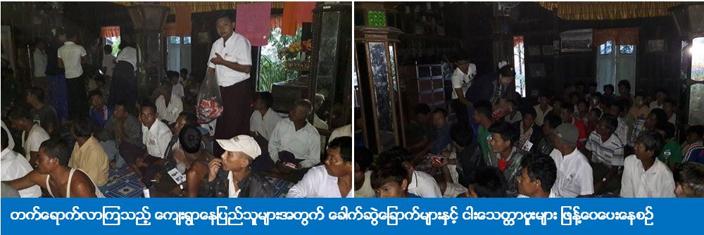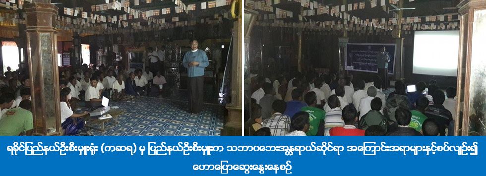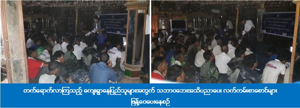 (၁၁-၆-၂၀၁၆) ရက်နေ့တွင် ရခိုင်ပြည်နယ်၊ စစ်တွေမြို့နယ်၊ ကျေးတောကျေးရွာ၌ ရက် (၁၀၀) စီမံချက်အရ ဆောင်ရွက်သည့် သဘာဝဘေးအန္တရာယ်ဆိုင်ရာ အသိပညာပေးဟောပြောပွဲကို ရခိုင်ပြည်နယ်ဦးစီးမှူးရုံး (ကဆရ) မှ ဦးဆောင်ပြုလုပ်ခဲ့ပြီး ပြည်နယ်ဦးစီးမှူးနှင့် တာဝန်ရှိသူများမှ သဘာဝဘေးအန္တရာယ်ဆိုင်ရာအကြောင်းအရာများနှင့် စပ်လျဉ်း၍ ဟောပြောဆွေးနွေးခဲ့ကြပြီး တက်ရောက်လာကြသည့် ကျေးရွာနေပြည်သူများအတွက် သဘာဝဘေးအသိပညာပေး လက်ကမ်းစာစောင်များ၊ ခေါက်ဆွဲခြောက်များနှင့် ငါးသေတ္တာဗူးများ ဖြန့်ဝေပေးခဲ့ပါသည်။ ဟောပြောပွဲသို့ ကျေးရွာနေပြည်သူ (၂၀၀) ဦး တက်ရောက်ခဲ့ကြောင်း သိရှိရပါသည်။