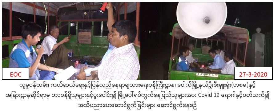 လူမှုဝန်ထမ်း၊ ကယ်ဆယ်ရေးနှင့်ပြန်လည်နေရာချထားရေးဝန်ကြီးဌာန၊ ဘေးအန္တရာယ်ဆိုင်ရာစီမံခန့်ခွဲမှုဦးစီးဌာန၊ ပေါက်မြို့နယ် ဦးစီးမှူးရုံးမှတာဝန်ရှိသူများသည် (၂၇.၃.၂၀၂၀)ရက်နေ့ ညနေ (၂၀း၃၀) အချိန်မှ (၂၂း၀၀) အချိန်အထိ ပေါက်မြို့နယ်အထွေထွေအုပ်ချုပ်ရေးဦးစီးဌာနနှင့်ပူးပေါင်း၍ မြို့ပေါ်ရပ်ကွက်များဖြစ်သည့် အောင်တံခွန်၊ အောင်ချမ်းသာ၊ အောင်တော်မူ၊ ရွှေပေါက်ပင် ရပ်ကွက်များတွင်လှည့်လည်၍covid 19 ရောဂါနှင့်ပတ်သက်၍ ဆောင်ရန်/ရှောင်ရန်အချက်များအား အသိပညာပေးခြင်းများ ဆောင်ရွက်ခဲ့ကြောင်း သတင်းရရှိပါသည်။