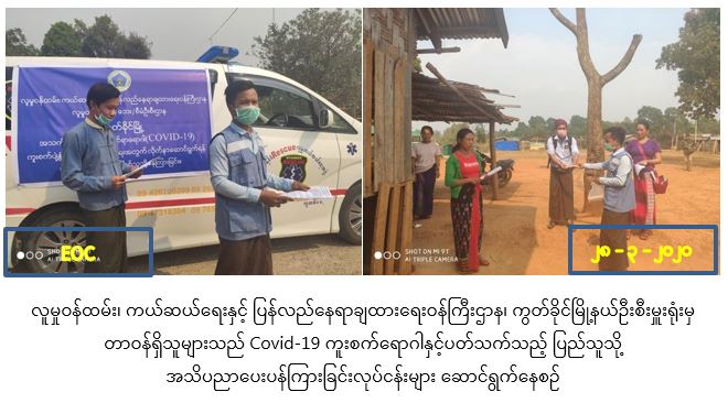 လူမှုဝန်ထမ်း၊ ကယ်ဆယ်ရေးနှင့် ပြန်လည်နေရာချထားရေးဝန်ကြီးဌာန၊ ဘေးအန္တရာယ်ဆိုင်ရာစီမံခန့်ခွဲမှုဦးစီးဌာန၊ ကွတ်ခိုင်မြို့နယ်ဦးစီးမှူးရုံးမှ တာဝန်ရှိသူများသည် မတ်လ (၂၈) ရက်နေ့တွင် လူမူဝန်ထမ်းဉီးစီးဌာန၊ ဂရုဏာလူမူကူညီရေးအသင်းမှ တာဝန်ရှိသူများနှင့်အတူ ကွတ်ခိုင်မြို့နယ်အတွင်းရှိ IDPs စခန်းများဖြစ်သော အမှတ် (၅) ရပ်ကွက်camp နှင့် ကာလိုင် (၂) camp များမှအိမ်ထောင်စု (၂၃၁) စု လူဉီးရေ (၁၃၆၀) ဉီးအား COVID-19 ရောဂါကူးစက်ပျံ့နှံမှုများ မဖြစ်ပွားစေရန်အတွက် လိုက်နာဆောင်ရွက်ရန် ပြည်သူသို့ပန်ကြားချက် စာစောင်များဖြန့်ဝေခြင်း၊ လက်ကိုင်စကားပြောစက်ဖြင့် ဆွေးနွေးဟောပြောခြင်း၊ လက်ဆေးဆပ်ပြာများ ဝေငှခြင်း တို့ကိုကွင်းဆောင်ရွက်ခဲ့ပါကြောင်း သတင်းရရှိပါသည်။