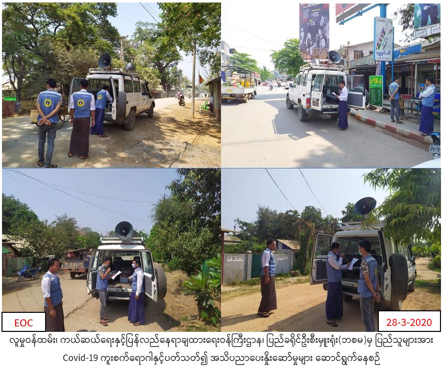 လူမှုဝန်ထမ်း၊ ကယ်ဆယ်ရေးနှင့်ပြန်လည်နေရာချထားရေးဝန်ကြီးဌာန၊ ဘေးအန္တရာယ်ဆိုင်ရာစီမံခန့်ခွဲမှုဦးစီးဌာန၊ ပြည်ခရိုင်ဦးစီးမှူးရုံးမှ တာဝန်ရှိသူများသည် (၂၇-၃-၂၀၂၀)ရက်နေ့နှင့် (၂၈-၃-၂၀၂၀)ရက်နေ့များတွင် ပြည်မြို့၊ မြို့ပေါ်ရပ်ကွက်များသို့ COVID-19 ကူးစက်ရောဂါနှင့် ပတ်သက်၍ အသိပညာပေးနှိုးဆော်မှုများ ဆောင်ရွက်လျက်ရှိကြောင်း သတင်းရရှိပါသည်။