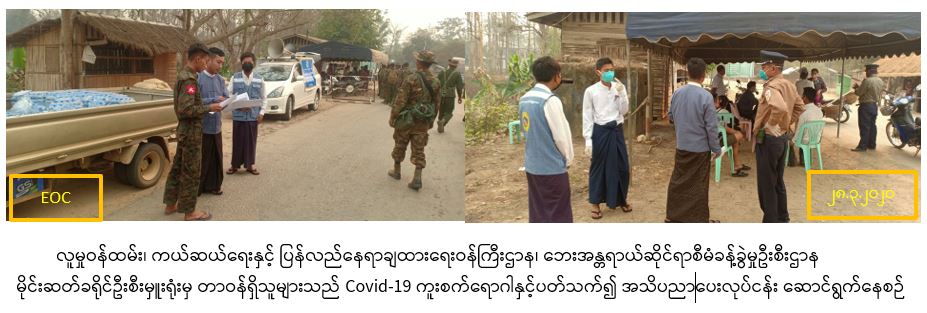 လူမှုဝန်ထမ်း၊ ကယ်ဆယ်ရေးနှင့် ပြန်လည်နေရာချထားရေးဝန်ကြီးဌာန၊ ဘေးအန္တရာယ်ဆိုင်ရာ စီမံခန့်ခွဲမှုဉီးစီးဌာန၊ မိုင်းဆတ်ခရိုင်ဦးစီးမှူးရုံးမှ တာဝန်ရှိသူများသည် (၂၈-၃-၂၀၂၀) ရက်နေ့၊ (၁၅:၀၀) နာရီတွင် မိုင်းဆတ်မြို့ဝင်တံတားနှင့် ဝိန်းနေရပ်ကွက်များသို့ Covid-19 ကြိုတင်ကာကွယ် ထိန်းချုပ်နိုင်ရန် ပြည်သူအသိပညာပေး ပန်ကြားခြင်းများ ပြုလုပ်ခဲ့ကြောင်း သတင်းရရှိပါသည်။