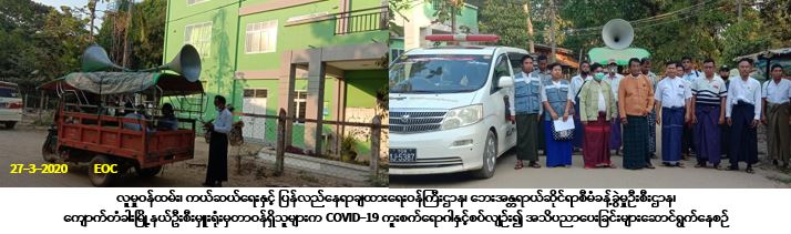 လူမှုဝန်ထမ်း၊ ကယ်ဆယ်ရေးနှင့် ပြန်လည်နေရာချထားရေးဝန်ကြီးဌာန၊ ဘေးအန္တရာယ်ဆိုင်ရာစီမံခန့်ခွဲမှုဉီးစီးဌာန၊ ကျောက်တံခါးမြို့နယ်ဦးစီးမှူးရုံးမှတာဝန်ရှိသူများသည် ကျောက်တံခါးမြို့နယ်လွှတ်တော်ကိုယ်စားလှယ်၊ မြို့နယ်အထွေထွေအုပ်ချုပ်ရေးဦးစီးဌာန၊ မြို့နယ်ကျန်းမာရေး ဦးစီးဌာနတို့နှင့်ပူးပေါင်း၍ (၂၇-၃-၂၀၂၀) ရက်နေ့၊ (၁၇:၀၀)နာရီအချိန်မှစတင်၍ ကျောက်တံခါးမြို့ရှိ ရပ်ကွက် (၅) ရပ်ကွက်တို့၌ COVID-19 ကူးစက်ရောဂါနှင့်စပ်လျဉ်း၍ ဆောင်ရန်/ရှောင်ရန်အချက်များ အသိပညာပေးခြင်းကို ဆောင်ရွက်လျက်ရှိပါကြောင်း သတင်းရရှိိပါသည်။