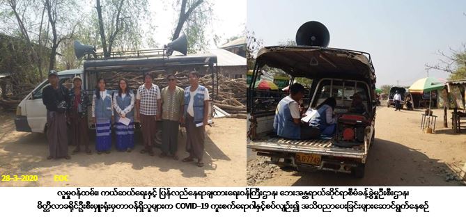 လူမှုဝန်ထမ်း၊ ကယ်ဆယ်ရေးနှင့် ပြန်လည်နေရာချထားရေးဝန်ကြီးဌာန၊ ဘေးအန္တရာယ်ဆိုင်ရာစီမံခန့်ခွဲမှုဉီးစီးဌာန၊ မိတ္ထီလာခရိုင်ဦးစီးမှူးရုံးမှတာဝန်ရှိသူများသည် (၂၈-၃-၂၀၂၀) ရက်နေ့တွင် မိတ္ထီလာမြို့နယ်၊ ရေဝေအုပ်စု၊ ဇရပ်ကုန်းအုပ်စု၊ လိန်တောအုပ်စု၊ ရေချိုအုပ်စု၊ လျှော်ဖြူကန်အုပ်စု၊ မန်းကျည်းကုန်းအုပ်စုရှိကျေးရွာများ၌ COVID-19 ကူးစက်ရောဂါနှင့်စပ်လျဉ်း၍ ဆောင်ရန်/ရှောင်ရန်အချက်များ လှည့်လည်အသိပညာပေးခြင်းကို ကျေးရွာအုပ်ချုပ်ရေးများနှင့်အတူ ပူးပေါင်းဆောင်ရွက်ခဲ့ပါကြောင်း သတင်းရရှိိပါသည်။