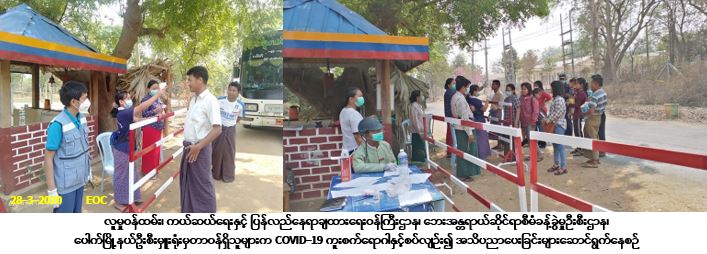 လူမှုဝန်ထမ်း၊ ကယ်ဆယ်ရေးနှင့် ပြန်လည်နေရာချထားရေးဝန်ကြီးဌာန၊ ဘေးအန္တရာယ်ဆိုင်ရာစီမံခန့်ခွဲမှုဉီးစီးဌာန၊ ပေါက်မြို့နယ်ဦးစီးမှူးရုံးမှတာဝန်ရှိသူများသည် ပေါက်မြို့နယ်အထွေထွေအုပ်ချုပ်ရေးဦးစီးဌာန၊ မြို့နယ် ပြည်သူ့ကျန်းမာရေးဦးစီးဌာန၊ မြို့နယ်မီးသတ်ဦးစီးဌာန၊ မြန်မာနိုင်ငံရဲတပ်ဖွဲ့၊ မြို့နယ်ကြက်ခြေနီအသင်း၊ မြို့နယ်အဆင့်ဌာနဆိုင်ရာများနှင့်ပူးပေါင်း၍ (၂၈-၃-၂၀၂၀) ရက်နေ့၊ (၀၉:၃၀) နာရီအချိန်မှ (၁၆:၀၀) နာရီအချိန် အထိ ပေါက်မြို့အဝင် ပေါက် – ပခုက္ကူလမ်းမကြီး၌ ပေါက်မြို့တွင်းသို့ အဝင်/အထွက် ယာဉ်လိုင်းများတွင် စီးနင်းလိုက်ပါလာသော ခရီးသည်များအား COVID-19 ကူးစက်ရောဂါနှင့်စပ်လျဉ်း၍ ဆောင်ရန်/ရှောင်ရန်အချက်များ အသိပညာပေးခြင်း၊ ကျန်းမာရေးစစ်ဆေးခြင်းနှင့် မှတ်တမ်းကောက်ယူခြင်းများ ဆောင်ရွက်ခဲ့ပါကြောင်း သတင်းရရှိိပါသည်။