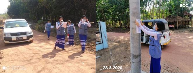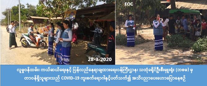 လူမှုဝန်ထမ်း၊ ကယ်ဆယ်ရေးနှင့် ပြန်လည်နေရာချထားရေးဝန်ကြီးဌာန၊ ဘေးအန္တရာယ် ဆိုင်ရာ စီမံခန့်ခွဲမှုဉီးစီးဌာန၊ သထုံခရိုင်ဦးစီးမှူးရုံးမှ တာဝန်ရှိသူများသည် (၂၈-၃-၂၀၂၀) ရက်နေ့ (၁၃:၀၀) နာရီအချိန်မှ (၁၇:၀၀) နာရီအချိန်ထိ မွန်ပြည်နယ်၊ သထုံခရိုင်၊ သထုံမြို့နယ် ဒူးရင်းဆိပ်ကျေးရွာအုပ်စု၊ ကြာပန်းကျေးရွာ၊ ကဇိုင်းကျေးရွာ၊ သမ္ဘာန်ကျေးရွာ အင်းရှည် ကျေးရွာ၊ ဆူးအင်းကျေးရွာနှင့် ဓနုကျေးရွာအုပ်စု ဓရိုးကျေးရွာ ညာဓဝယ်ကျေးရွာ တို့တွင် COVID -19 ကူးစက်ရောဂါနှင့်ပတ်သက်၍ အသိပညာပေးခြင်းနှင့် လက်ကမ်းစာစောင် ဖြန့်ဝေ ခြင်းများဆောင်ရွက်ခဲ့ကြောင်း သိရှိရပါသည်။