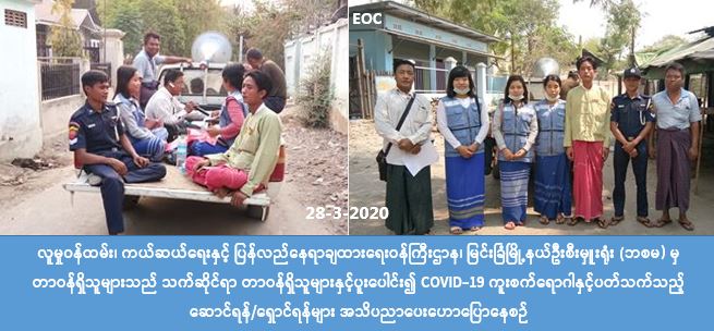 လူမှုဝန်ထမ်း၊ ကယ်ဆယ်ရေးနှင့် ပြန်လည်နေရာချထားရေးဝန်ကြီးဌာန၊ ဘေးအန္တရာယ် ဆိုင်ရာ စီမံခန့်ခွဲမှုဉီးစီးဌာန၊ မြင်းခြံမြို့နယ်ဦးစီးမှူးရုံးမှ တာဝန်ရှိသူများသည် ခရိုင်ပြည်သူ့ ကျန်းမာရေးဦးစီးဌာန၊ မြို့နယ်မီးသတ်ဦးစီးဌာန၊ မြို့နယ်အထွေထွေအုပ်ချုပ်ရေး ဦးစီးဌာန၊ အမှတ်(၆)လူငယ် လူမှုကူညီရေးအသင်းမှ တာဝန်ရှိသူများနှင့် ပူးပေါင်း၍(၂၈-၃-၂၀၂၀) ရက်နေ့ (၁၀:၀၀)နာရီမှ စတင်ပြီး မြင်းခြံမြို့နယ်အတွင်းရှိ ရပ်ကွက်(၁၆)ခု၊ကျေးရွာ(၈)ရွာသို့ လှည့်လည်ပြီး COVID -19 ကူးစက်ရောဂါနှင့်ပတ်သက်ပြီး ဆောင်ရန်/ ရှောင်ရန် တို့အား အသိပညာပေးဟောပြောဆောင်ရွက်ခဲ့ကြောင်း သိရှိရပါသည်။