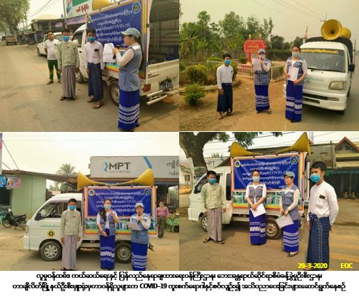 လူမှုဝန်ထမ်း၊ ကယ်ဆယ်ရေးနှင့် ပြန်လည်နေရာချထားရေးဝန်ကြီးဌာန၊ ဘေးအန္တရာယ်ဆိုင်ရာစီမံခန့်ခွဲမှုဉီးစီးဌာန၊ တာချီလိတ်မြို့နယ်ဦးစီးမှူးရုံးမှတာဝန်ရှိသူများသည် အလင်းရောင်ပရဟိတလူမှုကူညီရေးအသင်းနှင့် ပူးပေါင်း၍ (၂၉-၃-၂၀၂၀) ရက်နေ့တွင် တာချီလိတ်မြို့နယ်၊ တာလေမြို့ပေါ်၌လည်းကောင်း၊ တာလေမြို့၊ ကျေးရွာအုပ်စုအတွင်းရှိကျေးရွာများ၌လည်းကောင်း COVID-19 ကူးစက်ရောဂါနှင့်စပ်လျဉ်း၍ ကြိုတင်ကာကွယ်နိုင်ရန် ရှမ်း၊ မြန်မာဘာသာစကားဖြင့် အသံချဲ့စက်ကိုအသုံးပြု၍ ပြည်သူသို့ လှည့်လည်အသိပညာပေးခြင်းနှင့် လက်ကမ်းစာစောင်များဖြန့်ဝေခြင်းတို့ကို ဆောင်ရွက်ခဲ့ပါကြောင်း သတင်းရရှိိပါသည်။