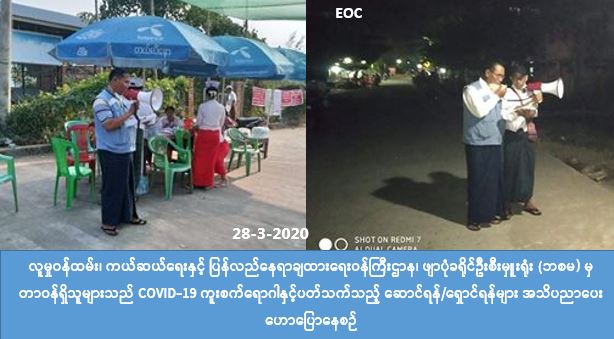 လူမှုဝန်ထမ်း၊ ကယ်ဆယ်ရေးနှင့် ပြန်လည်နေရာချထားရေးဝန်ကြီးဌာန၊ ဘေးအန္တရာယ် ဆိုင်ရာ စီမံခန့်ခွဲမှုဉီးစီးဌာန၊ ဧရာဝတီတိုင်းဒေသကြီး၊ ဖျာပုံခရိုင်ဦးစီးမှူးရုံးမှ တာဝန်ရှိသူ များသည် (၂၈-၃-၂၀၂၀) ရက်နေ့တွင် Covid -19 ကူးစက်ရောဂါနှင့်ပတ်သက်၍ အသိပညာ ပေးဟောပြောြခင်းကို ဆောင်ရွက်ခဲ့ကြောင်း သိရှိရပါသည်။