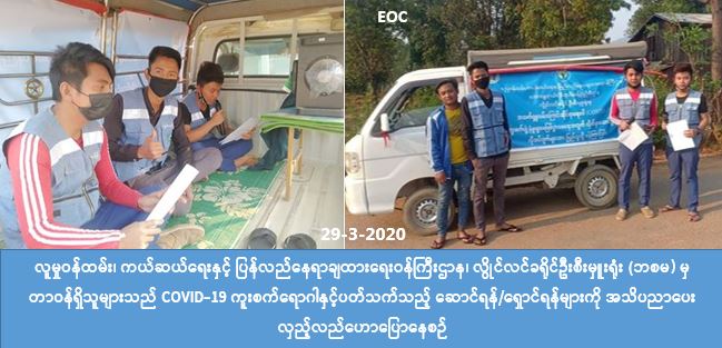 (၂၉-၃-၂၀၂၀)ရက်နေ့ နံနက် (၁၀:၀၀) နာရီအချိန်တွင် လူမှုဝန်ထမ်း၊ ကယ်ဆယ်ရေးနှင့် ပြန်လည်နေရာချထားရေးဝန်ကြီးဌာန၊ ဘေးအန္တရာယ်ဆိုင်ရာ စီမံခန့်ခွဲမှုဉီးစီးဌာန၊ ရှမ်းပြည်နယ် လွိုင်လင်ခရိုင်ဦးစီးမှူးရုံးမှ တာဝန်ရှိသူများသည် လွိုင်လင်မြို့ပေါ်ရှိ ရပ်ကွက်အားလုံးအား Covid-19 နှင့်ပတ်သက်သည့်ဆောင်ရန်/ ရှောင်ရန်များ၊ လိုက်နာရမည့် အချက်များကို မော်တော်ယာဥ်ဖြင့် လှည့်လည် အသိပညာပေးဟောပြောခဲ့ကြောင်း သိရှိရပါသည်။
