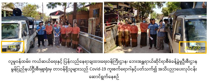 လူမှုဝန်ထမ်း၊ ကယ်ဆယ်ရေးနှင့် ပြန်လည်နေရာချထားရေးဝန်ကြီးဌာန၊ ဘေးအန္တရာယ်ဆိုင်ရာ စီမံခန့်ခွဲမှုဉီးစီးဌာန၊ မွန်ပြည်နယ်ဦးစီးမှူးရုံးမှ တာဝန်ရှိသူများသည် မွန်ပြည်နယ် လူမှုဝန်ထမ်းဦးစီးဌာနနှင့်အတူ (၂၈-၃-၂၀၂၀) ရက်နေ့ ညနေပိုင်းတွင် ကျိုက်မရောမြို့နယ်အတွင်းရှိ ကျုံဝမ်း၊ ကျုံမနင်း၊ ကျိုက်ပရန် ကျေးရွာ (၃) ရွာတို့တွင် COVID -19 ကူးစက်ရောဂါနှင့်ပတ်သက်ပြီး ဆောင်ရန်/ ရှောင်ရန် တို့ကို အသိပညာပေးကြေငြာခြင်းနှင့် လက်ကမ်းစာစောင်များဖြန့်ဝေခြင်းတို့ကို ဆောင်ရွက်ခဲ့ကြောင်း သတင်းရရှိပါသည်။