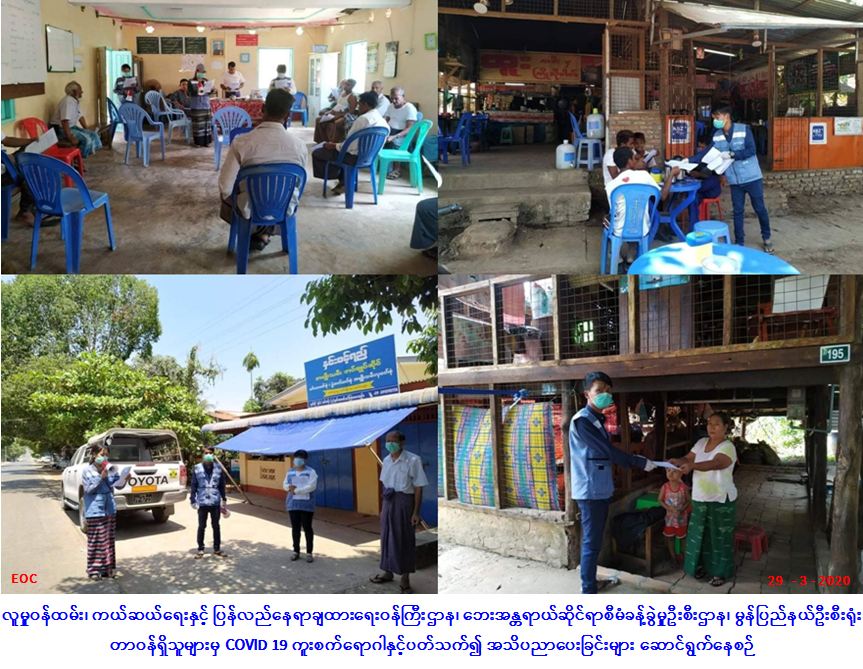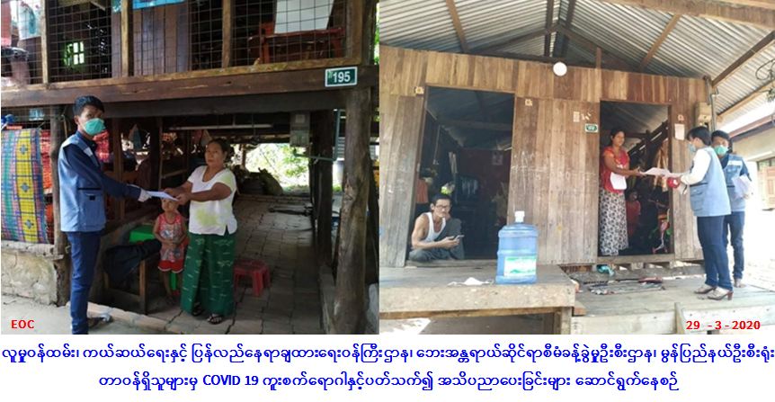 လူမှုဝန်ထမ်း၊ ကယ်ဆယ်ရေးနှင့် ပြန်လည်နေရာချထားရေးဝန်ကြီးဌာန၊ ဘေးအန္တရာယ်ဆိုင်ရာစီမံ ခန့်ခွဲမှုဦးစီးဌာန၊ မွန်ပြည်နယ်ဦးစီးရုံးမှ တာဝန်ရှိသူများသည် (၂၉-၃-၂၀၂၀) ရက်နေ့ (၁၀:၀၀) နာရီမှ (၁၅:၀၀) နာရီအထိ မော်လမြိုင်မြို့နယ်ရှိ တောင်ဝိုင်းရပ်ကွက်၊ မြိုင်သာယာရပ်ကွက်၊ ကျိုက်မရော မြို့နယ်ရှိ ရေတွင်းကုန်းကျေးရွာ၊ ပိန္နဲကုန်းကျေးရွာများသို့ လှည့်လည်ပြီး COVID-19 ကူးစက်ရောဂါနှင့် ပတ်သတ်၍ ဆောင်ရန်၊ ရှောင်ရန်တို့ကို ရပ်ကွက်၊ ကျေးရွာနေပြည်သူများအား အသိပညာပေး ဟောပြောခြင်း၊ လက်ကမ်းစာစောင်မျှဝေခြင်းလုပ်ငန်းများ ဆောင်ရွက်ခဲ့ပါကြောင်း သတင်းရရှိပါသည်။