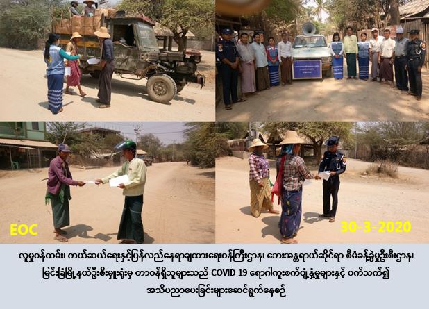 လူမှုဝန်ထမ်း၊ ကယ်ဆယ်ရေးနှင့် ပြန်လည်နေရာချထားရေးဝန်ကြီးဌာန၊ ဘေးအန္တရာယ် ဆိုင်ရာစီမံခန့်ခွဲမှုဉီးစီးဌာန၊ မြင်းခြံမြို့နယ်ဦးစီးမှူးရုံးမှ တာဝန်ရှိသူများသည် ခရိုင်ပြည်သူ့ ကျန်းမာရေးဦးစီးဌာန၊ မြို့နယ်မီးသတ်ဦးစီးဌာန၊ မြို့နယ်အထွေထွေ အုပ်ချုပ်ရေးဦးစီး ဌာန၊ အမှတ် (၆) လူငယ် လူမှုကူညီရေးအသင်းမှ တာဝန်ရှိသူများနှင့် ပူးပေါင်း၍ (၂၉-၃-၂၀၂၀) ရက်နေ့ ၊ ( ၀၉ : ၀၀ ) နာရီမှ စတင်ပြီး မြင်းခြံမြို့နယ်အတွင်း ဆီမီးခုံမြို့ရှိ ရပ်ကွက် (၄) ခုနှင့်ကျေးရွာ (၁၄) ရွာသို့ လှည့်လည်ပြီး COVID -19 ကူးစက်ရောဂါနှင့် ပတ်သက်၍ ဆောင်ရန်/ ရှောင်ရန်များအား အသိပညာပေးဟောပြောခြင်းနှင့် လက်ကမ်းစာစောင် ဖြန့်ဝေခြင်းများဆောင်ရွက်ခဲ့ကြောင်းသတင်းရရှိပါသည်။