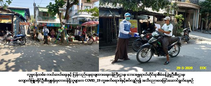 လူမှုဝန်ထမ်း၊ ကယ်ဆယ်ရေးနှင့် ပြန်လည်နေရာချထားရေးဝန်ကြီးဌာန၊ ဘေးအန္တရာယ်ဆိုင်ရာစီမံခန့်ခွဲမှုဉီးစီးဌာန၊ ကျောက်ဖြူခရိုင်ဦးစီးမှူးရုံးမှတာဝန်ရှိသူများသည် (၂၉-၃-၂၀၂၀) ရက်နေ့တွင် (၁၃:၀၀)နာရီအချိန်မှ (၁၄:၂၀) နာရီအချိန်အထိ ကျောက်ဖြူမြို့နယ်၊ ရခိုင်ပိုက်ဆိပ်ရပ်ကွက်၌ COVID-19 ကူးစက်ရောဂါနှင့်စပ်လျဉ်း၍ ကြိုတင်ကာကွယ်နိုင်ရန် ဆောင်ရန်/ရှောင်ရန်အချက်များကို Hand Speaker ဖြင့်လှည့်လည်အသိပေးနှိုးဆော်ခဲ့ပြီး လက်ကမ်းစာစောင်များဖြန့်ဝေခဲ့ပါကြောင်း သတင်းရရှိိပါသည်။