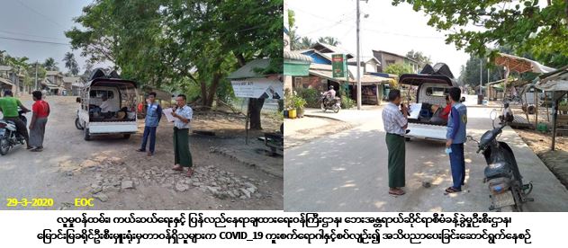လူမှုဝန်ထမ်း၊ ကယ်ဆယ်ရေးနှင့် ပြန်လည်နေရာချထားရေးဝန်ကြီးဌာန၊ ဘေးအန္တရာယ်ဆိုင်ရာစီမံခန့်ခွဲမှုဉီးစီးဌာန၊ မြောင်းမြခရိုင်ဦးစီးမှူးရုံးမှတာဝန်ရှိသူများသည် (၂၉-၃-၂၀၂၀) ရက်နေ့၊ (၁၄:၀၀)နာရီအချိန်မှ စတင်၍ မြောင်းမြခရိုင်၊ အိမ်မဲမြို့နယ်၊ မြို့ပေါ်ရှိ ရပ်ကွက်(၅)ခု၌ COVID-19 ကူးစက်ရောဂါနှင့်စပ်လျဉ်း၍ ကြိုတင်ကာကွယ်နိုင်ရန် ဆောင်ရန်/ရှောင်ရန်အချက်များကို အသိပညာပေးနှိုးဆော်ခဲ့ပါကြောင်း သတင်းရရှိိပါသည်။