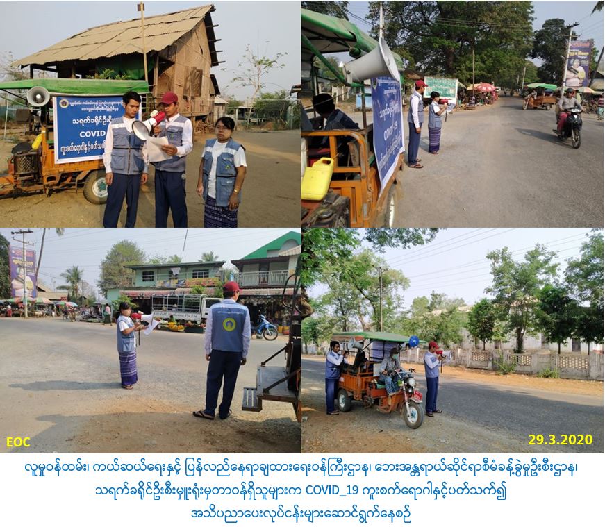လူမှုဝန်ထမ်း၊ ကယ်ဆယ်ရေးနှင့် ပြန်လည်နေရာချထားရေးဝန်ကြီးဌာန၊ ဘေးအန္တရာယ်ဆိုင်ရာစီမံခန့်ခွဲမှုဦးစီးဌာန၊ သရက်ခရိုင်ဦးစီးမှူးရုံးမှတာဝန်ရှိသူများသည် (၂၉-၃-၂၀၂၀) ရက်နေ့တွင် သရက်မြို့နယ်အတွင်းရှိ အကောက်တဲကျေးရွာ၊ ဇော်ဂျီရပ်ကွက်၊ ရထားဘူတာအနီးရှိစျေးနှင့် အ.ထ.က (၁) လမ်းဆုံတို့တွင် COVID-19 ကူးစက်ရောဂါနှင့် ပတ်သက်၍ အသိပညာပေးလုပ်ငန်းများကို ဆောင်ရွက်ခဲ့ပါကြောင်း သတတင်းရရှိပါသည်။