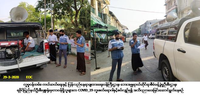 လူမှုဝန်ထမ်း၊ ကယ်ဆယ်ရေးနှင့် ပြန်လည်နေရာချထားရေးဝန်ကြီးဌာန၊ ဘေးအန္တရာယ်ဆိုင်ရာစီမံခန့်ခွဲမှုဉီးစီးဌာန၊ ရခိုင်ပြည်နယ်ဦးစီးမှူးရုံးမှတာဝန်ရှိသူများသည် (၂၉-၃-၂၀၂၀) ရက်နေ့တွင် စစ်တွေမြို့၊ မြို့ပေါ်ရပ်ကွက်များ၌ COVID-19 ကူးစက်ရောဂါနှင့်စပ်လျဉ်း၍ ကြိုတင်ကာကွယ်နိုင်ရန် ဆောင်ရန်/ရှောင်ရန်အချက်များကို အသိပညာပေးနှိုးဆော်ခဲ့ပါကြောင်း သတင်းရရှိိပါသည်။