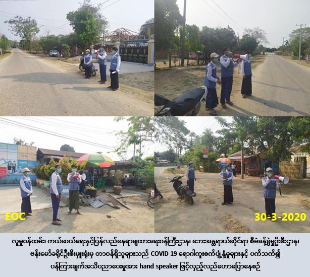 လူမှုဝန်ထမ်း၊ ကယ်ဆယ်ရေးနှင့် ပြန်လည်နေရာချထားရေးဝန်ကြီးဌာန၊ ဘေးအန္တရာယ်ဆိုင်ရာ စီမံခန့်ခွဲမှုဉီးစီးဌာန၊ ဗန်းမော်ခရိုင်ဉီးစီးမှူးရုံးမှ တာဝန်ရှိသူများသည် (၂၇-၃-၂၀၂၀) ရက်နေ့တွင် ဗန်းမော်မြို့နယ်ရှိ (၃)မိုင် ရွှေပြည်သာရပ်ကွက်များအတွင်းသို့ လှည့်လည်၍ အသက်ရှူလမ်း ကြောင်းဆိုင်ရာ ကူးစက်ရောဂါ COVID- 19 ကာကွယ်၊ တားဆီးထိန်းချုပ်ကုသရေးဆိုင်ရာ ပြည်သူသို့ ပန်ကြားချက်အသိပညာပေးမှုအား hand speaker ဖြင့် လှည့်လည်ဟောပြော ဆောင်ရွက်ခဲ့ကြောင်းသတင်းရရှိပါသည်။