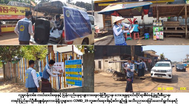 လူမှုဝန်ထမ်း၊ ကယ်ဆယ်ရေးနှင့် ပြန်လည်နေရာချထားရေးဝန်ကြီးဌာန၊ ဘေးအန္တရာယ်ဆိုင်ရာစီမံခန့်ခွဲမှုဉီးစီးဌာန၊ ကရင်ပြည်နယ်ဦးစီးမှူးရုံးမှတာဝန်ရှိသူများသည် (၂၉-၃-၂၀၂၀) ရက်နေ့တွင် ကရင်ပြည်နယ်၊ ဘားအံမြို့နယ်၊ အိန္ဒု စံပြကျေးရွာအတွင်းရှိ ရပ်ကွက်/ ကျေးရွာ(၁၆)ခုနှင့် သာမညကျေးရွာအုပ်စုရှိ ရပ်ကွက်/ကေျးရွာ (၁၇)ခုတို့၌ COVID-19 ကူးစက်ရောဂါနှင့်စပ်လျဉ်း၍ ကြိုတင်ကာကွယ်နိုင်ရန် ဆောင်ရန်/ရှောင်ရန်အချက်များကို ရပ်ကွက်/ကေျးရွာအုပ်ချုပ်ရေးမှူးများနှင့်ပူးပေါင်း၍ အသိပညာပေးနှိုးဆော်ခဲ့ပါကြောင်း သတင်းရရှိိပါသည်။