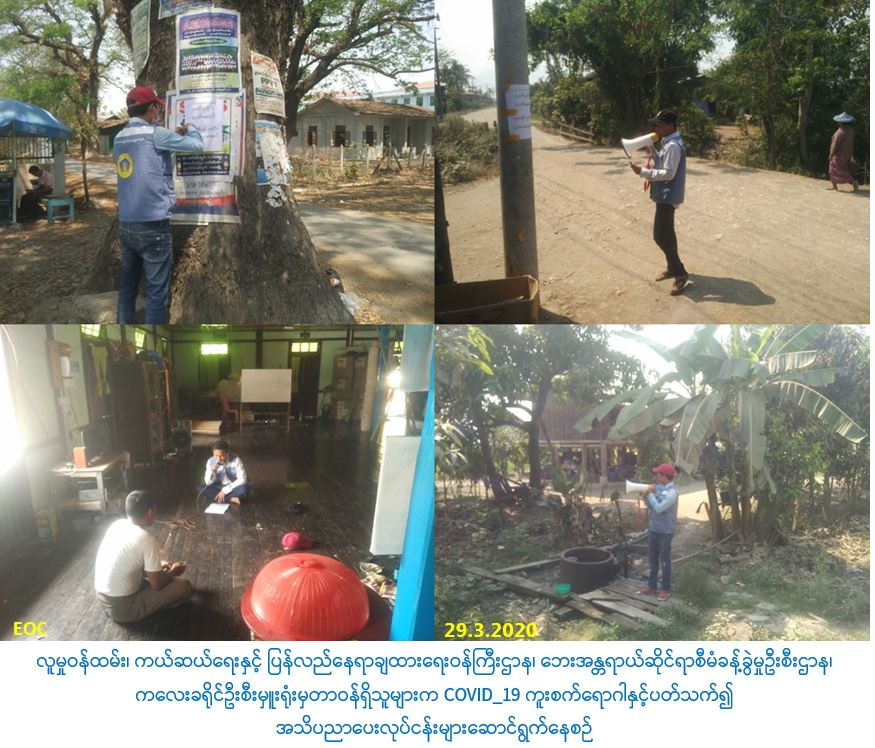 လူမှုဝန်ထမ်း၊ ကယ်ဆယ်ရေးနှင့် ပြန်လည်နေရာချထားရေးဝန်ကြီးဌာန၊ ဘေးအန္တရာယ်ဆိုင်ရာစီမံခန့်ခွဲမှုဦးစီးဌာန၊ ကလေးခရိုင်ဦးစီးမှူးရုံးမှ တာဝန်ရှိသူများသည် (၂၉-၃-၂၀၂၀) ရက်နေ့တွင် ကလေးမြို့နယ်၊ ကျောင်းတိုက်အုပ်စု၊ ကျောင်းတိုက်ကျေးရွာနှင့် သဖန်းအိုင်ကျေးရွာတို့တွင် covid-19 ကူးစက်ရောဂါနှင့်ပတ်သက်၍ အသိပညာပေးကြော်ငြာခြင်းနှင့် လက်ကမ်းစာများ ကပ်ခြင်းတို့ကို ဆောင်ရွက်ခဲ့ပါကြောင်း သတင်းရရှိပါသည်။