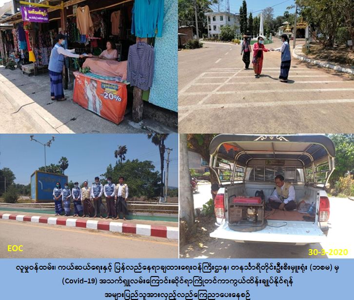 လူမှုဝန်ထမ်း၊ ကယ်ဆယ်ရေးနှင့် ပြန်လည်နေရာချထားရေးဝန်ကြီးဌာန၊ ဘေးအန္တရာယ် ဆိုင်ရာစီမံခန့်ခွဲမှုဦးစီးဌာန၊ တနင်္သာရီတိုင်းဒေသကြီးဦးစီးမှူးရုံးနှင့် တိုင်းဒေသကြီး လူမှုဝန်ထမ်းဦးစီးမှူးရုံးတို့ပူးပေါင်း၍ (၃၀-၃-၂၀၂၀) ရက်နေ့၌ တနင်္သာရီတိုင်းဒေသကြီး၊ ထား၀ယ်ခရိုင် ၊ ရေဖြူမြို့နယ်၊ (က) ရပ်ကွက်၊ (ခ) ရပ်ကွက်၊ (ဂ) ရပ်ကွက်နှင့် (ဃ) ရပ်ကွက်တို့တွင် လော်စပီကာ၊ hand speaker တို့ဖြင့် (Covid-19) အသက်ရှူလမ်းကြောင်းဆိုင်ရာရောဂါ ကြိုတင်ကာကွယ် ထိန်းချုပ်နိုင်ရန် အများပြည်သူသို့ အသိပညာပေးပန်ကြားချက်များအား လှည့်လည်ကြေညာခြင်းနှင့် ပြည်သူ့ကျန်းမာရေးဦးစီးဌာနမှ ထုတ်ပြန်ထာသော (Covid-19) ရောဂါနှင့် ပတ်သက်သည့် အသိပညာပေးလက်ကမ်းစာစောင်များ ဖြန့်ဝေခြင်းတို့ကို ဆောင်ရွက်ခဲ့ပါကြောင်း သတင်းရရှိပါသည်။