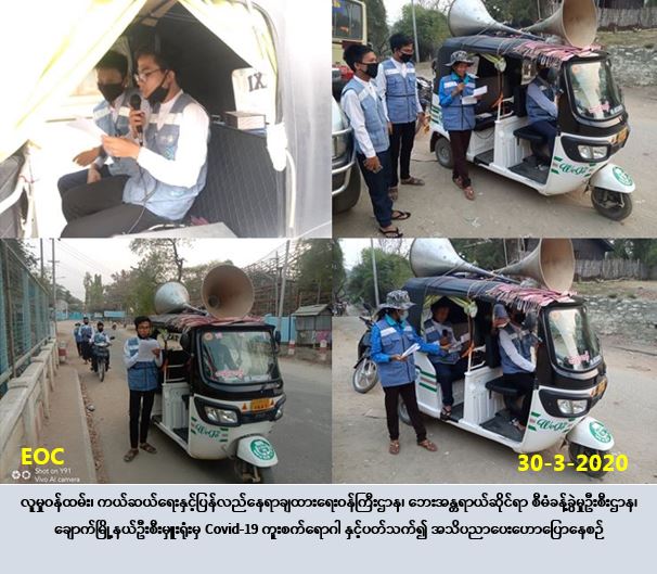 လူမှုဝန်ထမ်း၊ ကယ်ဆယ်ရေးနှင့် ပြန်လည်နေရာချထားရေးဝန်ကြီးဌာန၊ ဘေးအန္တရာယ်ဆိုင်ရာ စီမံခန့်ခွဲမှုဉီးစီးဌာန၊ ချောက်မြို့နယ်ဦးစီးမှူးရုံးမှ တာဝန်ရှိသူများသည် (၂၈-၃-၂၀၂၀ )ရက်နေ့တွင် ချောက်မြို့နယ်အတွင်းရှိ အဒမှတ်(၁)၊အမှတ်(၂)၊ အမှတ်(၃)နှင့် အမှတ်(၄)ရပ်ကွက်များသို့ covid – 19 ရောဂါ ကာကွယ်ထိန်းချုပ်ရေးနှင့် အသိပညာပေးခြင်းကို ဆောင်ရွက်ခဲ့ကြောင်းသတင်းရရှိ ပါသည်။