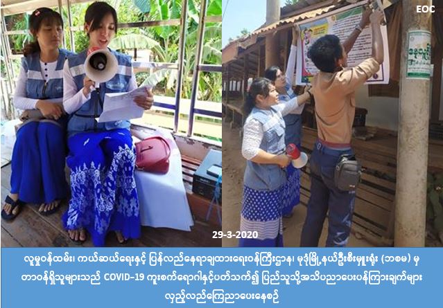 လူမှုဝန်ထမ်း၊ ကယ်ဆယ်ရေးနှင့် ပြန်လည်နေရာချထားရေးဝန်ကြီးဌာန၊ ဘေးအန္တရာယ်ဆိုင်ရာ စီမံခန့်ခွဲမှုဉီးစီးဌာန၊ မုဒုံမြို့နယ်ဦးစီးမှူးရုံးမှ တာဝန်ရှိသူများသည် (၂၉-၃-၂၀၂၀) ရက်နေ့ (၁၀:၀၀) နာရီအချိန်မှ (၁၃:၀၀) နာရီအချိန်ထိ မွန်ပြည်နယ်၊ မော်လမြိုင်ခရိုင်၊ မုံဒုံမြို့နယ်၊ ကျုံဖိုက်ကျေးရွာနှင့် ညောင်ကုန်းကျေးရွာအတွင်းရှိ လမ်းဆုံလမ်းခွများနှင့် လူစည်ကားရာ နေရာများတွင် COVID -19 ကူးစက်ရောဂါနှင့်ပတ်သက်၍ ကြိုတင်ကာကွယ် ထိန်းချုပ်နိုင်ရန် ပြည်သူသို့ အသိပညာပေးပန်ကြားချက်များအား လှည့်လည်အသိပေး ကြေငြာခြင်းများ ဆောင်ရွက်ခဲ့ကြောင်း သိရှိရပါသည်။