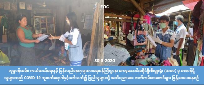 (၃၀-၃-၂၀၂၀)ရက်နေ့တွင်လူမှုဝန်ထမ်း၊ ကယ်ဆယ်ရေးနှင့် ပြန်လည်နေရာချထားရေးဝန်ကြီးဌာန၊ ဘေးအန္တရာယ်ဆိုင်ရာ စီမံခန့်ခွဲမှုဦးစီးဌာန၊ တနင်္သာရီတိုင်းဒေသကြီး၊ ကော့သောင်းခရိုင်ဦးစီးမှူးရုံးမှ တာဝန်ရှိသူများသည် ကော့သောင်းမြို့၊ အောင်သုခရပ်ကွက်ရှိ ပြည်သူများအား Covid_19 ရောဂါနှင့်ပတ်သက်၍ အသိပညာပေးလက်ကမ်းစာစောင်များဖြန့်ဝေပေးခဲ့ကြောင်း သိရှိရပါသည်။