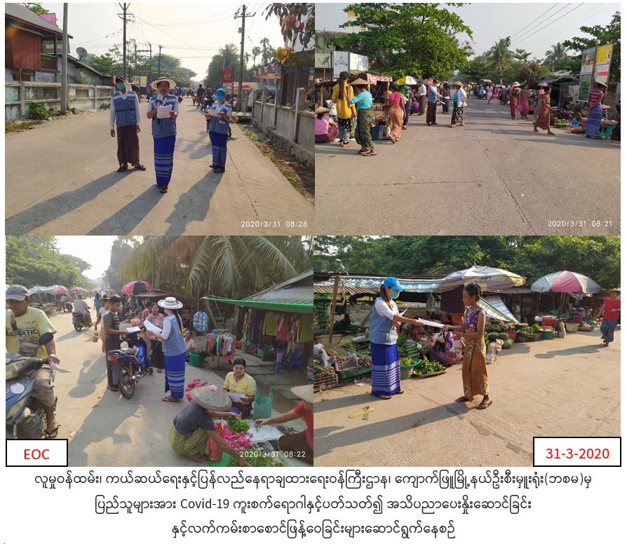 လူမှုဝန်ထမ်း၊ ကယ်ဆယ်ရေးနှင့်ပြန်လည်နေရာချထားရေးဝန်ကြီးဌာန၊ ဘေးအန္တရာယ်ဆိုင်ရာစီမံခန့်ခွဲမှုဦးစီးဌာန၊ ကျောက်ဖြူခရိုင်ဦးစီးမှုးရုံးမှ တာဝန်ရှိသူများသည် (၃၁-၃-၂၀၂၀)ရက်နေ့ နံနက်(၀၈း၀၀) အချိန်မှ (၀၉း၁၅)အချိန်အထိ ကျောက်ဖြူမြို့နယ်၊ ကုလားဘာတောင်ရပ်ကွက်စျေး အတွင်း COVID-19 ရောဂါ နှင့်ပတ်သက်၍ ဆောင်ရန်၊ရှောင်ရန်များအား သိရှိလိုက်နာဆောင်ရွက်နိုင်ရန် Hand Speaker ဖြင့် လိုက်လံနှိုးဆော်ခြင်းနှင့် လက်ကမ်းစာစောင်များဖြန့်ဝေခြင်းတို့ကို ဆောင်ရွက်ခဲ့ကြောင်း သတင်းရရှိပါသည်။