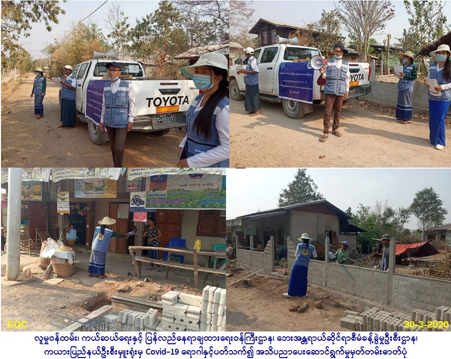 လူမှုဝန်ထမ်း၊ ကယ်ဆယ်ရေးနှင့် ပြန်လည်နေရာချထားရေးဝန်ကြီးဌာန၊ ဘေးအန္တရာယ်ဆိုင်ရာစီမံခန့်ခွဲမှုဦးစီးဌာန၊ ကယားပြည်နယ်ဦးစီးမှူးရုံးမှ တာဝန်ရှိသူများသည် (၃၀-၃-၂၀၂၀) ရက်နေ့တွင် ကယားပြည်နယ်၊ ဒီးမော့ဆိုမြို့နယ်၊ ငွေတောင် ကျေးရွာအုပ်စု၊ ညောင်ကုန်းကျေးရွာရှိ ပြည်သူများအား Covid-19 ရောဂါနှင့်ပတ်သက်၍ အသိပညာပေး လက်ကမ်းစာစောင် များဖြန့်ဝေပေးခဲ့ကြောင်း သတင်းရရှိပါသည်။