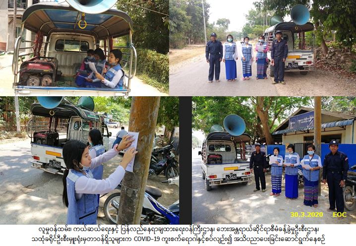 လူမှုဝန်ထမ်း၊ ကယ်ဆယ်ရေးနှင့် ပြန်လည်နေရာချထားရေးဝန်ကြီးဌာန၊ ဘေးအန္တရာယ်ဆိုင်ရာစီမံခန့်ခွဲမှုဦးစီး ဌာန၊ သထုံခရိုင်ဦးစီးမှူးရုံးမှတာဝန်ရှိသူများသည် (၃၀-၃-၂၀၂၀) ရက်နေ့၊ (၁၀:၃၀)နာရီအချိန်မှ (၁၄:၃၀) နာရီအချိန်အထိ မွန်ပြည်နယ် သထုံခရိုင်၊ သထုံမြို့နယ် ဂေါ့ကျေးရွာနှင့် ကျုံပါကျေးရွာတို့၌ COVID-19 ကူးစက်ရောဂါနှင့်စပ်လျဉ်း၍ အသိပညာပေးခြင်းနှင့် လက်ကမ်းစာစောင်ကပ်ခြင်းများဆောင်ရွက်ခဲ့ပါကြောင်း သတင်းရရှိပါသည်။