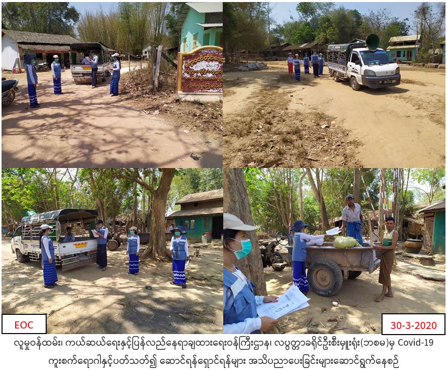 လူမှုဝန်ထမ်း၊ ကယ်ဆယ်ရေးနှင့် ပြန်လည်နေရာချထားရေးဝန်ကြီးဌာန၊ ဘေးအန္တရာယ်ဆိုင်ရာစီမံခန့်ခွဲမှုဉီးစီးဌာန၊ လပွတ္တာခရိုင်ဦးစီးမှူးရုံးမှ တာဝန်ရှိသူများသည် (၃၀-၃ -၂၀၂၀)ရက်နေ့တွင် လပွတ္တာမြို့နယ်၊ ကြာကန်ကျေးရွာအုပ်စု၊ ကြာကန်ကျေးရွာ၊ မင်းကုန်းကျေးရွာသရက်ကုန်းများသို့ သွားရောက်၍ COVID-19 နှင့် ပတ်သက်၍ ဆောင်ရန်/ ရှောင်ရန်များအား လိုက်နာဆောင်ရွက်သွားကြရန် အသံချဲ့စက်ဖြင့် ဟောပြောနှိုးဆော်ခြင်းများဆောင်ရွက်ခဲ့ကြောင်း သတင်းရရှိပါသည်။