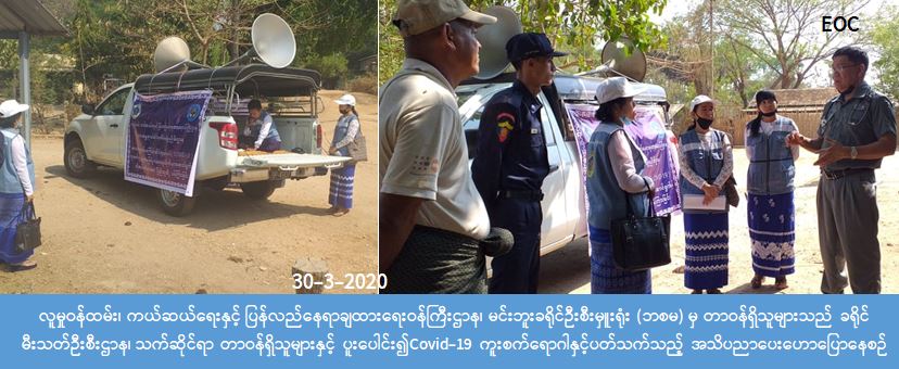 လူမှုဝန်ထမ်း၊ ကယ်ဆယ်ရေးနှင့် ပြန်လည်နေရာချထားရေးဝန်ကြီးဌာန၊ ဘေးအန္တရာယ်ဆိုင်ရာ စီမံခန့်ခွဲမှုဦးစီး ဌာန၊ မင်းဘူးခရိုင်ဦးစီးမှူးရုံးမှ တာဝန်ရှိသူများသည် (၃၀-၃-၂၀၂၀) ရက်နေ့တွင် မင်းဘူးမြို့နယ်၊ ခြင်ထောင်ကျေးရွာ၊ နိဗ္ဗာန်ကျွန်းကျေးရွာ၊ ရွာသစ်ကုန်းကျေးရွာနှင့် ထုံးမကြီးကျေးရွာများအတွင်း Covid-19 ရောဂါ ကူးစက်ပျံ့နှံ့မှုမဖြစ်ပွားစေရန် သိရှိလိုက်နာဆောင်ရွက်ရမည့်အချက်များကို ခရိုင်မီးသတ်ဦးစီးဌာနမှ တာဝန်ရှိ သူများ၊ ကျေးရွာအုပ်ချုပ်ရေးမှူးများ၊ ရပ်မိရပ်ဖများနှင့် ပူးပေါင်း၍ အသိပေးဟောပြောခဲ့ကြောင်း သိရှိရပါသည်။