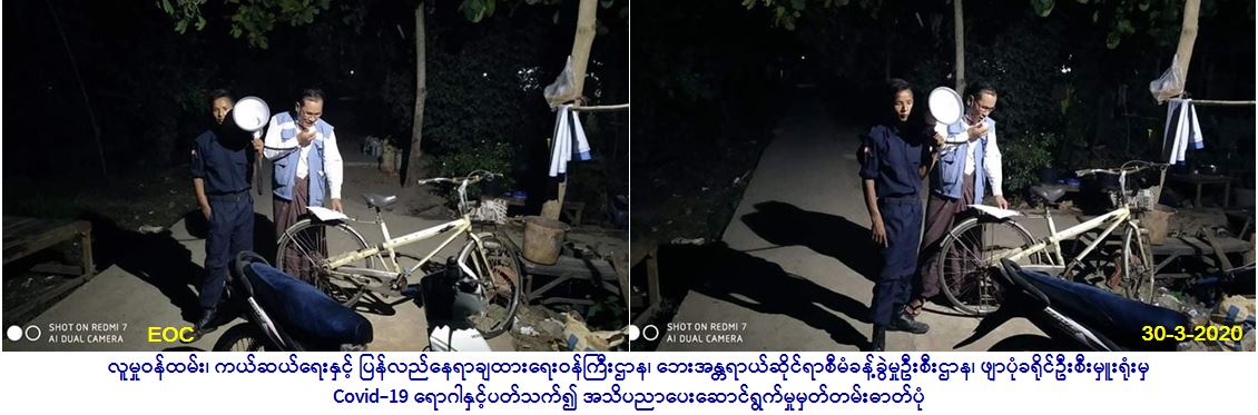 လူမှုဝန်ထမ်း၊ ကယ်ဆယ်ရေးနှင့်ပြန်လည်နေရာချထားရေးဝန်ကြီးဌာန၊ ဘေးအန္တရာယ်ဆိုင်ရာစီမံခန့်ခွဲမှုဦးစီးဌာန၊ ဖျာပုံခရိုင် ဦးစီးမှူးရုံးမှ တာဝန်ရှိသူများသည် ဧရာဝတီတိုင်းဒေသကြီး၊ ဖျာပုံခရိုင်စီးမှူးရုံးမှ ဖျာပုံမြို့ရှိ ရပ်ကွက်၊ ၁၄၊ ၁၅၊ ၁၆၊ ၁၇၊ ၁၈ ရှိ ရပ်ကွက်နေပြည်သူများအား (၃၀-၃-၂၀၂၀) ရက်နေ့၊ ည (၉:၀၀) နာရီအချိန်တွင် covid-19 ကပ်ရောဂါနှင့်ပတ်သက်၍အသိ ပညာပေးဆောင်ရွက်ခဲ့ပါကြောင်း သတင်းရရှိပါသည်။