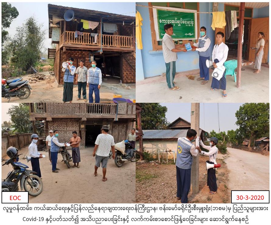 လူမှုဝန်ထမ်း၊ ကယ်ဆယ်ရေးနှင့်ပြန်လည်နေရာချထားရေးဝန်ကြီးဌာန၊ ဘေးအန္တရာယ်ဆိုင်ရာစီမံခန့်ခွဲမှုဦးစီးဌာန၊ ဗန်းမော်ခရိုင်ဦးစီးမှုးရုံးမှ တာဝန်ရှိသူများသည် (၃၀.၃..၂၀၂၀)ရက်နေ့တွင် ဗန်းမော်မြို့နယ်ရှိ ခိုကျင်ကျေးရွာ၊ မံခွန်ကျေးရွာနှင့် စီအင်ကျေးရွာ စုစုပေါင်းကျေးရွာ(၃)ခုအတွင်းသို့ လှည့်လည်၍ အသက်ရှူလမ်းကြောင်းဆိုင်ရာ ကူးစက်ရောဂါ COVID- 19 ကာကွယ်၊ တားဆီးထိန်းချုပ်ကုသရေးဆိုင်ရာ ပြည်သူသို့ ပန်ကြားချက်အသိပညာပေးမှုအား hand speakerများဖြင့် လှည့်လည်ဟောပြောခြင်းနှင့် လက်ကမ်းစာစောင်ဖြန့်ဝေခြင်းများ ဆောင်ရွက်ခဲ့ကြောင်းသတင်းရရှိပါသည်။