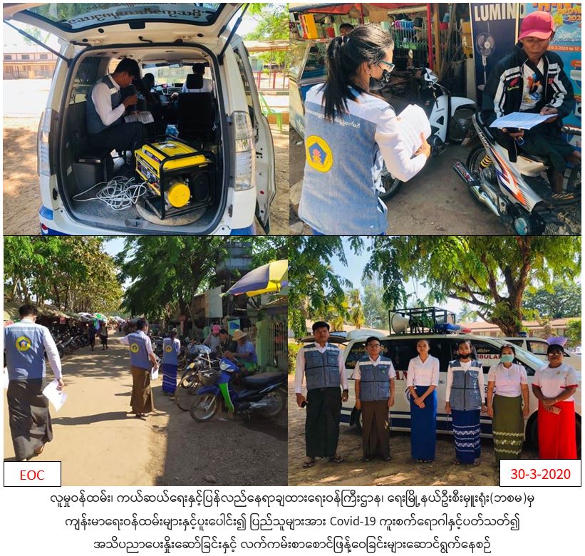 လူမှုဝန်ထမ်း၊ ကယ်ဆယ်ရေးနှင့်ပြန်လည်နေရာချထားရေးဝန်ကြီးဌာန၊ ဘေးအန္တရာယ်ဆိုင်ရာစီမံခန့်ခွဲမှုဉီးစီးဌာန၊ ရေးမြို့နယ်ဦးစီးမှူးရုံးမှ တာဝန်ရှိသူများသည် (၃၀-၃-၂၀၂၀) ရက်နေ့ (၁၃:၀၀) နာရီအချိန်မှ (၁၆:၀၀) နာရီအချိန်ထိမွန်ပြည်နယ်၊ မော်လမြိုင်ခရိုင်၊ ရေးမြို့နယ်၊ သီရိမာလာရပ်ကွက်၊ သီရိနန္ဒာရပ်ကွက်၊ ချောင်းတောင်ကျေးရွာအုပ်စုနှင့် ရေးမြို့မြသီတာဈေးတို့တွင် COVID -19 ကူးစက်ရောဂါနှင့်ပတ်သက်၍ ကြိုတင်ကာကွယ် ထိန်းချုပ်နိုင်ရန် ပြည်သူသို့ အသိပညာပေးခြင်းနှင့်လက်ကမ်းစာစောက်များဖြန့်ဝေခြင်းတို့ ဆောင်ရွက်ခဲ့ကြောင်း သတင်းရရှိပါသည်။