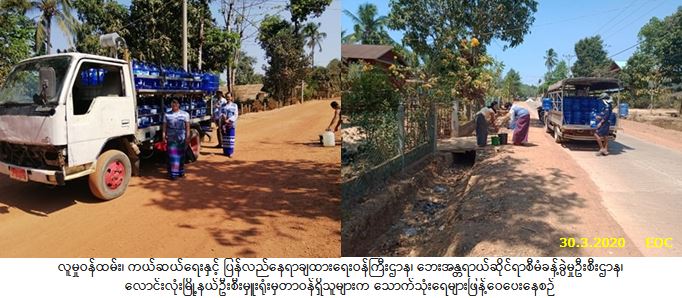 လူမှုဝန်ထမ်း၊ ကယ်ဆယ်ရေးနှင့် ပြန်လည်နေရာချထားရေးဝန်ကြီးဌာန၊ ဘေးအန္တရာယ်ဆိုင်ရာစီမံခန့်ခွဲမှုဦးစီး ဌာန၊ လောင်းလုံးမြို့နယ်ဦးစီးမှူးရုံးမှတာဝန်ရှိသူများသည် (၃၀-၃-၂၀၂၀) ရက်နေ့၊ (၁၃:၀၀) နာရီအချိန်တွင် လောင်းလုံးမြို့နယ်၊ လေးသွန်းခံကျေးရွာရှိ အိမ်ခြေ (၂၅၀) လုံးတို့အတွက် သောက်သုံးရေသန့် (၂၀လီတာဆံ) (၂၅၀) ဘူးကို သွားရောက်ဖြန့်ဝေပေးခဲ့ပါကြောင်း သတင်းရရှိပါသည်။