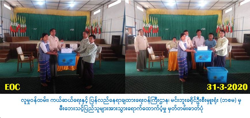 လူမှုဝန်ထမ်း၊ ကယ်ဆယ်ရေးနှင့် ပြန်လည်နေရာချထားရေးဝန်ကြီးဌာန၊ ဘေးအန္တရာယ်ဆိုင်ရာစီမံ ခန့်ခွဲမှုဦးစီးဌာန၊ မင်းဘူးခရိုင်ဦးစီးမှူးရုံးမှ တာဝန်ရှိသူများသည် (၃၀-၃-၂၀၂၀) ရက်နေ့တွင် ပွင့်ဖြူ မြို့နယ်၊ မင်းတဲကုန်းကျေးရွာနှင့် မင်းဇံကျေးရွာတို့၌ ဖြစ်ပွားခဲ့သော မီးဘေးကြောင့် မီးဘေးသင့် အိမ်ခြေ(၂)လုံး၊ အိမ်ထောင်စု(၂)စုတို့အတွက် အိမ်ဆောက်ပစ္စည်းဖိုး(၃၀၀,၀၀၀/-)ကျပ်၊ လူဦးရေ (၈) ဦးအတွက် ဆန်ရိက္ခာ(၇)ရက်စာ (၁၆,၈၀၀/-)ကျပ်၊ သေဆုံးသူ(၁)ဦးအတွက် (၃၀၀,၀၀ဝ/-)ကျပ်၊ စုစုပေါင်းထောက်ပံ့ငွေ(၆၁၆,၈၀၀/-)ကျပ်၊ ကယ်ဆယ်ရေးပစ္စည်း(၁၆)မျိုးပါ အိမ်ထောင်စု (၂) စုစာတို့ အား (၃၁-၃-၂၀၂၀) ရက်နေ့၊ (၁၁:၄၅) အချိန်တွင် လွှတ်တော်ကိုယ်စားလှယ်၊ အထွေထွေအုပ်ချုပ်ရေးဦးစီးဌာနမှ တာဝန်ရှိသူများနှင့်အတူ ဘေးသင့်ပြည်သူများထံ လက်ဝယ်အရောက် သွားရောက် ထောက်ပံ့ပေးအပ်ခဲ့ပါကြောင်း သတင်းရရှိပါသည်။