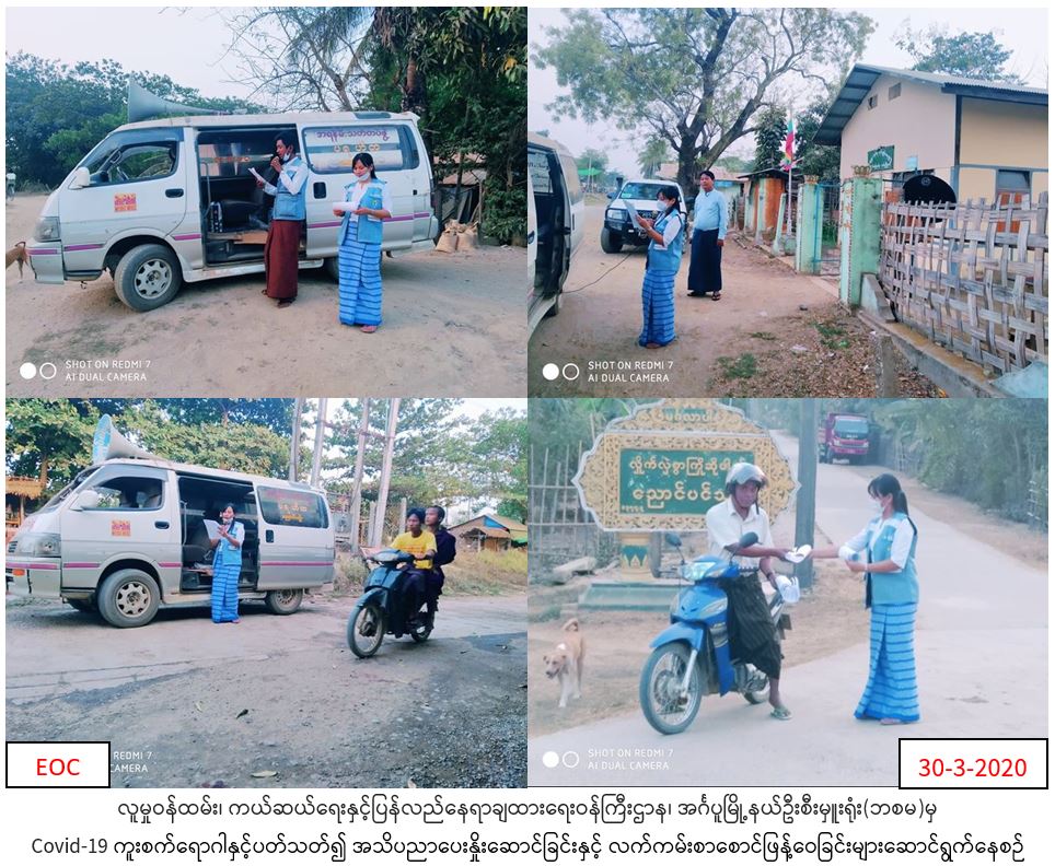 လူမှုဝန်ထမ်း၊ ကယ်ဆယ်ရေးနှင့်ပြန်လည်နေရာချထားရေးဝန်ကြီးဌာန၊ ဘေးအန္တရာယ်ဆိုင်ရာစီမံခန့်ခွဲမှုဦးစီးဌာန၊ အင်္ဂပူမြို့နယ်ဦးစီးမှူးရုံးမှ တာဝန်ရှိသူများသည် မြို့နယ်အထွေထွေအုပ်ချုပ်ရေးဦးစီးဌာန၊ မြို့နယ်မီးသတ်ဦးစီးဌာနတို့နှင့် ပူးပေါင်း၍ (၃၀-၃-၂၀၂၀) ရက်နေ့တွင် ညောင်ကျိုးအုပ်စုအတွင်းရှိ ကျေးရွာ များအတွင်း Covid-19 ကာကွယ်၊ တားဆီး၊ ထိန်းချုပ်၊ ကုသရေးဆိုင်ရာ ပြည်သူအသိပညာပေးပန်ကြားချက်များလှည့်လည်ဟောပြောခြင်း လက်ကမ်းစာစောင်ဖြန့်ဝေခြင်းများ ဆောင်ရွက်ခဲ့ကြောင်း သတင်းရရှိပါသည်။