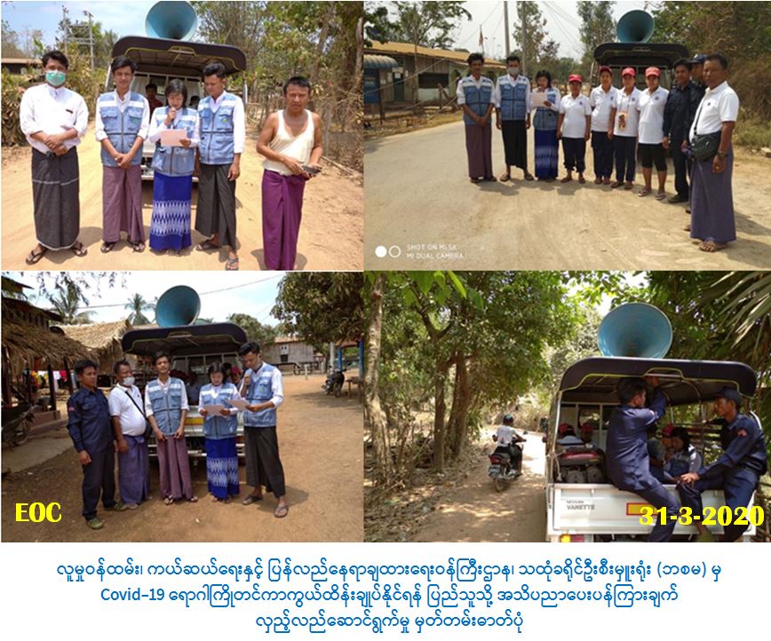လူမှုဝန်ထမ်း၊ ကယ်ဆယ်ရေးနှင့် ပြန်လည်နေရာချထားရေးဝန်ကြီးဌာန၊ ဘေးအန္တရာယ်ဆိုင်ရာစီမံ ခန့်ခွဲမှုဉီးစီးဌာန၊ သထုံခရိုင်ဦးစီးမှူးရုံးမှ တာဝန်ရှိသူများသည် (၃၁-၃-၂၀၂၀) ရက်နေ့၊ (၁၀:၀၀) နာရီအချိန်မှ (၁၃:၀၀) နာရီအချိန်ထိ မွန်ပြည်နယ် သထုံခရိုင်၊ သထုံမြို့နယ် စျေးမသွယ်အထက်ကျေးရွာအုပ်စုရှိ ပအိုဝ်စုပိုင်း၊ ကျောင်းပိုင်း၊ လမ်းမပိုင်း၊ သိမ်ကုန်းပိုင်းနှင့် စျေးမသွယ်အောက်ကျေးရွာအုပ်စုရှိ ရွာကြီးပိုင်း၊ ရွာလေးပိုင်း၊ နောင်ရပ်ပိုင်းတို့တွင် COVID -19 ကူးစက်ရောဂါနှင့်ပတ်သက်၍ အသိပညာပေးခြင်းနှင့် လက်ကမ်းစာစောင်ကပ်ခြင်းများ ဆောင်ရွက်လျက်ရှိကြောင်း သတင်းရရှိပါသည်။