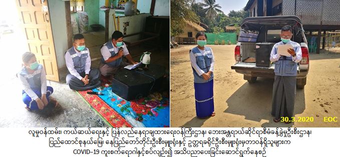 လူမှုဝန်ထမ်း၊ ကယ်ဆယ်ရေးနှင့် ပြန်လည်နေရာချထားရေးဝန်ကြီးဌာန၊ ဘေးအန္တရာယ်ဆိုင်ရာစီမံခန့်ခွဲမှုဦးစီး ဌာန၊ ပြည်ထောင်စုနယ်မြေ၊ နေပြည်တော်တိုင်းဦးစီးမှူးရုံးနှင့် ဥတ္တရခရိုင်ဦးစီးအမှူးရုံးမှတာဝန်ရှိသူများသည် (၃၀-၃-၂၀၂၀) ရက်နေ့၊ (၁၀:၀၀) နာရီအချိန်မှ (၁၆:၀၀) နာရီအချိန်အထိ ပုဗ္ဗသီရိမြို့နယ်၊ လယ်သာကျေးရွာ၊ တပ်ကုန်းမြို့နယ်၊ ဂတ်ချိုင်းကျေးရွာ၊ ဂတ်ကုန်းကျေးရွာ၊ ရွှေချိုင်းကျေးရွာ၊ မဲအင်းကျေးရွာ၊ တံခွန်တိုင်ကျေးရွာနှင့် ကံလှကျေးရွာများအတွင်း၌ COVID-19 ကူးစက်ရောဂါနှင့်စပ်လျဉ်း၍ ဆောင်ရန်/ရှောင်ရန်အချက်များကို အသိပညာပေးနှိုးဆော်ခဲ့ပါကြောင်း သတင်းရရှိပါသည်။