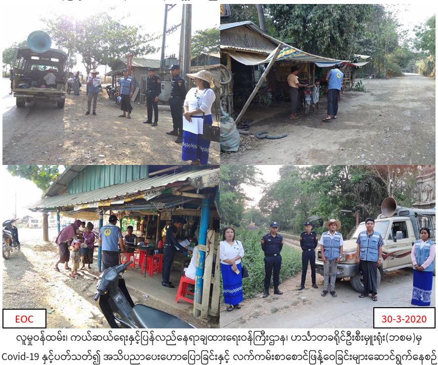 လူမှုဝန်ထမ်း၊ ကယ်ဆယ်ရေးနှင့်ပြန်လည်နေရာချထားရေးဝန်ကြီးဌာန၊ ဘေးအန္တရာယ်ဆိုင်ရာစီမံခန့်ခွဲမှုဉီးစီးဌာန၊ ဟင်္သာတခရိုင်ဦးစီးမှူးရုံးမှ တာဝန်ရှိသူများသည် လူမှုဝန်ထမ်း၊ မီးသတ်ဦးစီးဌာနတို့နှင့်ပူးပေါင်း၍ (၃၀-၃-၂၀၂၀) ရက်နေ့ နေ့လည် (၁၅:၃၀)နာရီအချိန်မှ စတင်ပြီး ဟင်္သာတမြို့နယ်၊ (လယ်တီ၊ ကျုံတုံး၊ ကုလားခတ်၊ လိပ်ချောင်း)အုပ်စုများအတွင်းရှိ ကျေးရွာများသို့လှည့်လည်ပြီး လတ်တလောဖြစ်ပွါးလျှက်ရှိသော COVID -19 ကူးစက်ရောဂါနှင့်ပတ်သက်ပြီး ဆောင်ရန်/ ရှောင်ရန် တို့အား ရပ်ကွက်/ ကျေးရွာနေပြည်သူတို့အား အသိပညာပေးဟော ပြောဆောင်ရွက်ခဲ့ကြောင်း သတင်းရရှိပါသည်။