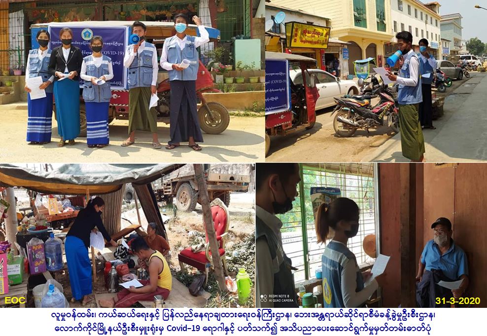 လူမှုဝန်ထမ်း၊ ကယ်ဆယ်ရေးနှင့် ပြန်လည်နေရာချထားရေးဝန်ကြီးဌာန၊ ဘေးအန္တရာယ်ဆိုင်ရာစီမံခန့်ခွဲမှုဦးစီးဌာန၊ လောက်ကိုင် မြို့နယ်ဦးစီးမှူးရုံးမှ တာဝန်ရှိသူများသည် (၃၁-၃-၂၀၂၀) ရက်နေ့တွင် လောက်ကိုင်ခရိုင် လူမှုဝန်ထမ်းဦးစီးဌာနနှင့် လောက်ကိုင်မြို့ပေါ်ရပ်ကွက်ဖြစ်သော ရပ်ကွက် (၂) တွင် Covid-19 ရောဂါကူးစက်ပျံ့နှံ့မှုမဖြစ်ပွားစေရန် သိရှိလိုက်နာ ဆောင်ရွက်ရမည့်အချက်များကို အသိပေးဟောပြောခြင်း၊လက်ကမ်းစာစောင်များဖြန့်ဝေခြင်းများကိုဆောင်ရွက်ခဲ့ပါကြောင်း သတင်းရရှိပါသည်။