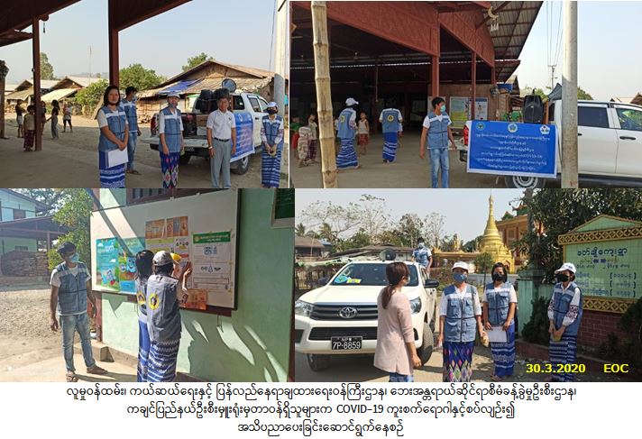 လူမှုဝန်ထမ်း၊ ကယ်ဆယ်ရေးနှင့် ပြန်လည်နေရာချထားရေးဝန်ကြီးဌာန၊ ဘေးအန္တရာယ်ဆိုင်ရာစီမံခန့်ခွဲမှုဦးစီး ဌာန၊ ကချင်ပြည်နယ်ဦးစီးမှူးရုံးမှတာဝန်ရှိသူများသည် (၃၀-၃-၂၀၂၀) ရက်နေ့တွင် ဝိုင်းမော်မြို့နယ်၊ ခတ်ချို အလယ်ပိုင်းကွက်သစ် IDPs စခန်းရှိ အိမ်ထောင်စု(၈၆) စုအတွက် ဆပ်ပြာ (၈၆) ခဲကိုပေးဝေခဲ့ပြီး ခပ်ချိုရပ်ကွက်၊ အမှတ်(၃) ရပ်ကွက်၊ ချမ်းမြေ့လူငယ် ဖွံ့ဖြိုးရေးဂေဟာ၊ မြို့မနှစ်ခြင်းစခန်း၊ မိုင်းနားဖွံ့ဖြိုးရေးခြံစခန်းတို့၌ COVID-19 ကူးစက်ရောဂါနှင့်စပ်လျဉ်း၍ ဆောင်ရန်/ရှောင်ရန်အချက်များကို အသံချဲ့စက်ဖြင့် လှည့်လည်အသိပညာပေး နှိုးဆော်ခဲ့ပြီး လက်ကမ်းစာစောင်များဖြန့်ဝေပေးခဲ့ပါကြောင်း သတင်းရရှိပါသည်။