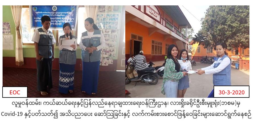 လူမှုဝန်ထမ်း၊ကယ်ဆယ်ရေးနှင့် ပြန်လည်နေရာချထားရေးဝန်ကြီးဌာန၊ ဘေးအန္တရာယ်ဆိုင်ရာစီမံခန့်ခွဲမှုဦးစီးဌာန၊ လားရှိုးခရိုင်ဦးစီးမှုးရုံးမှတာဝန်ရှိသူများသည် မတ်လ (၃၀)ရက်နေ့တွင် လားရှိုးမြို့၊ မန်ဆူရှမ်းကျောင်း၌ Covid-19ရောဂါ ကူးစက်ပျံ့ပွားမှုလျော့နည်းစေရေးနှင့် ကာကွယ်ထိန်းချုပ်နိုင်ရေးအတွက် ပြည်သူထံ အသိပေးပန်ကြားခြင်းကို အသံချဲ့စက်ကိုအသုံးပြု၍ ရှမ်းဘာသာ၊ မြန်မာဘာသာဖြင့် လည့်လည် ဆော်သြခဲ့ပြီး လက်ကမ်းစာစောင်များ ဖြန့်ဝေခဲ့ကြောင်း သတင်းရရှိပါသည်။