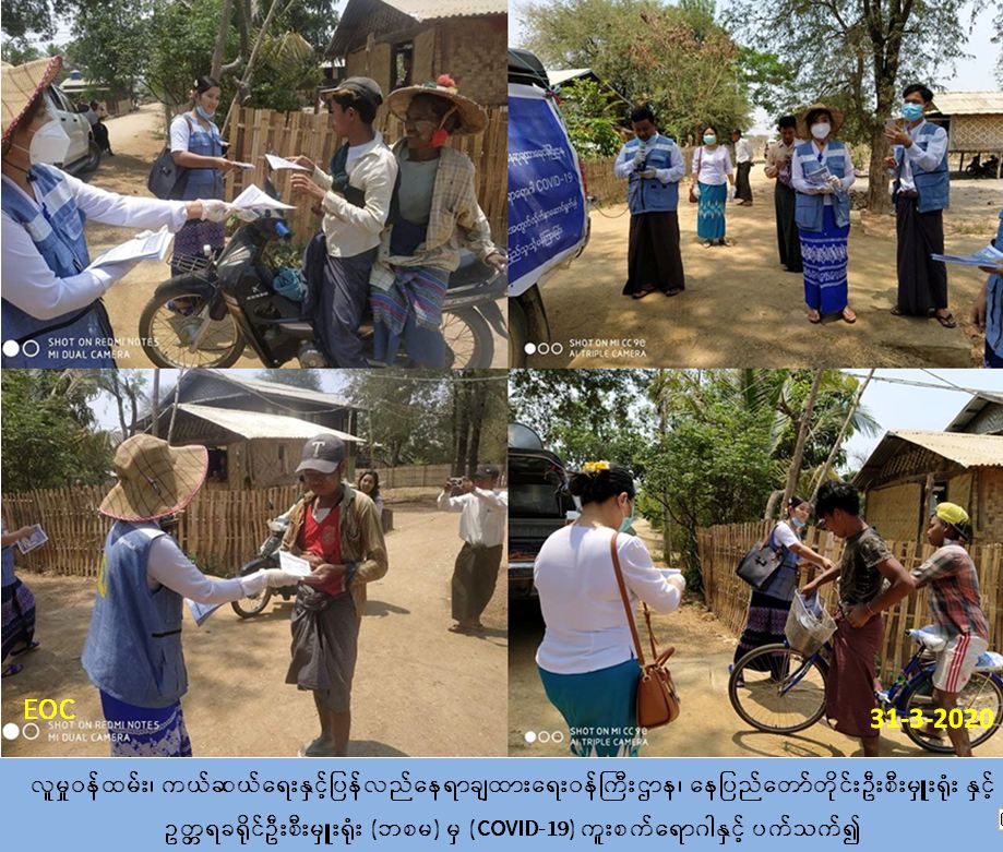 လူမှုဝန်ထမ်း၊ ကယ်ဆယ်ရေးနှင့် ပြန်လည်နေရာချထားရေးဝန်ကြီးဌာန၊ ဘေးအန္တရာယ် ဆိုင်ရာစီမံခန့်ခွဲမှုဉီးစီးဌာန၊ ပြည်ထောင်စုနယ်မြေ၊ နေပြည်တော်တိုင်းဦးစီးမှူးရုံးနှင့် ဥတ္တရ ခရိုင်ဦးစီးမှူးရုံးမှ တာဝန်ရှိသူများသည် (၃၁-၃-၂၀၂၀) ရက်နေ့ (၁၀:၃၀) အချိန်မှ (၁၃:၀၀) နာရီအချိန်အထိ ပြည်သူများအား COVID-19 ရောဂါကူးစက်ပြန့်နှံ့မှုများ မဖြစ်ပွားစေရန် အတွက် သိရှိလိုက်နာဆောင်ရွက်ရမည့် အချက်များနှင့် ပတ်သက်၍ အသိပညာပေးခြင်းကို ပုဗ္ဗသီရိမြို့နယ်၊ ကျည်တောင်ကန်ကျေးရွာအုပ်စု၊ မြောက်ချောင်း၊ နှမ်းခင်းကြီး၊ စက်ကုန်း ကျေးရွာများအတွင်းရှိ ပြည်သူများသို့ ထိရောက်စွာ လိုက်လံအသိပေး ဆောင်ရွက်ခဲ့ပါ ကြောင်းသတင်းရရှိပါသည်။